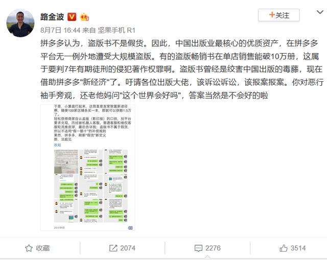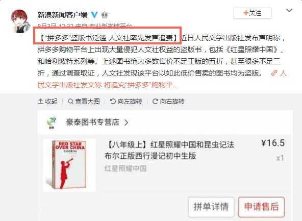 8月3日,由于拼多多盗版书泛滥,人民文学出版社率先发声称已向中央网信办进行举报,并将继续追究拼多多法律责任。