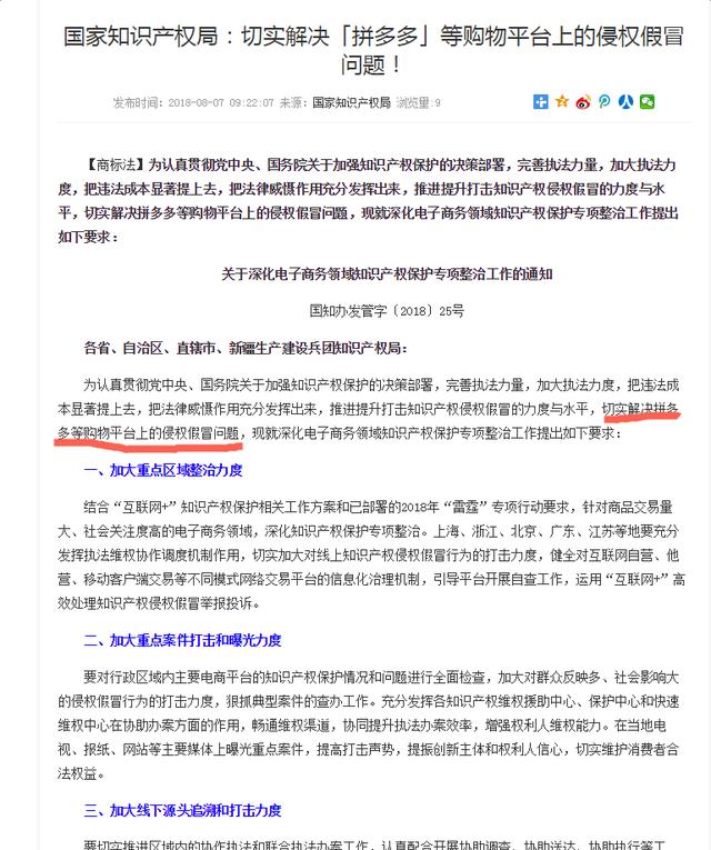 刚刚,国家知识产权局发布《关于深化电子商务领域专项整治工作的通知》,对提高知识产权保护水平提出了要求。国家知识产权局重点提到了拼多多,要求各地知识产权局提升打击知识产权侵权假冒的力度与水平,并切实解决拼多多等电子商务平台的侵权假冒问题。