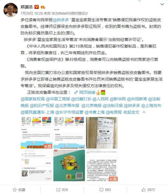 7月29日,知名作家郑渊洁通过个人微博发布声明称,接到多位读者的举报,经律师取证后证实,拼多多平台"星宝宝家居生活专营店"销售的皮皮鲁图书为盗版产品,侵犯其知识产权。
