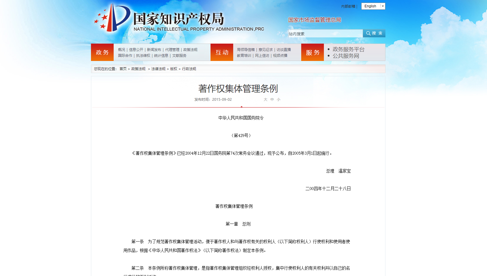 《著作权集体管理条例》已经2004年12月22日国务院第74次常务会议通过,现予公布,自2005年3月1日起施行。